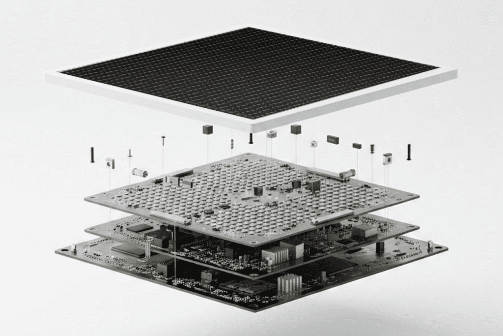 COB LED steht für Chip-on-Board – viele LED-Chips direkt auf die Platine gelötet und vergossen. Das ist der Standard für Premium Indoor: Die „pixelarme“, homogene Oberfläche ist ideal für Fine-Pitch (≤ 1,5 mm) in Boardrooms. Sie ist robust und langlebig.